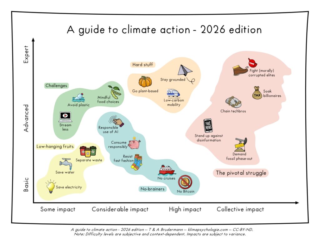 Außerdem haben wir eine neue Gruppe mit einer separaten Wirkungskategorie hinzugefügt: „The pivotal struggle“ (ich suche noch nach einer passenden deutschen Bezeichnung). Dieser „Struggle“ geht über die individuelle Ebene hinaus. Klimaschutz ist eine kollektive Aufgabe. Sie kann nicht gelingen, wenn eine moralisch korrupte Allianz aus Vertretern der fossilen Brennstoffindustrie, „Think Tanks”, Politiker*innen und Tech-Bros das Sagen hat, wie das unerträgliche Regime in Washington täglich neu zeigt.